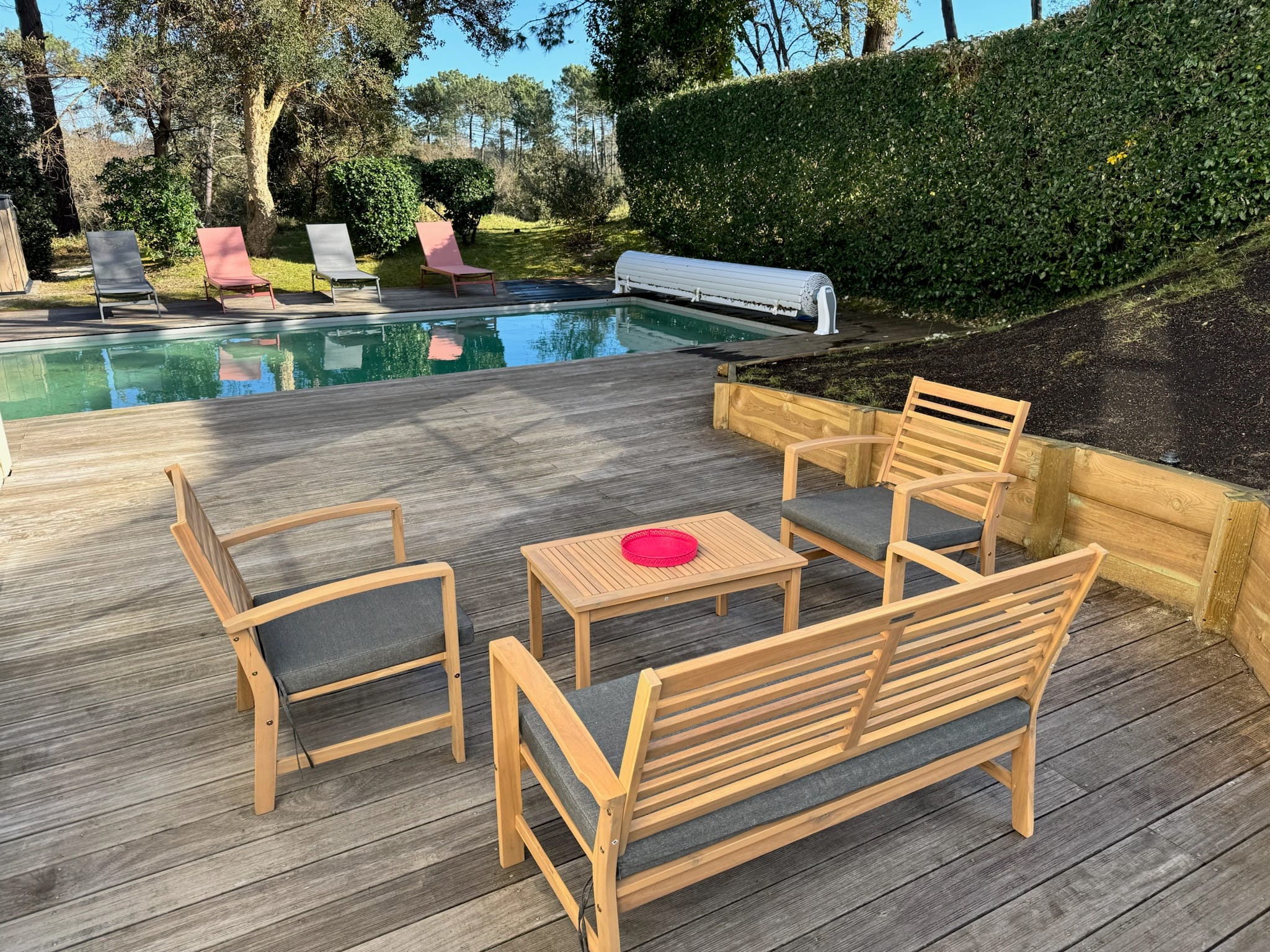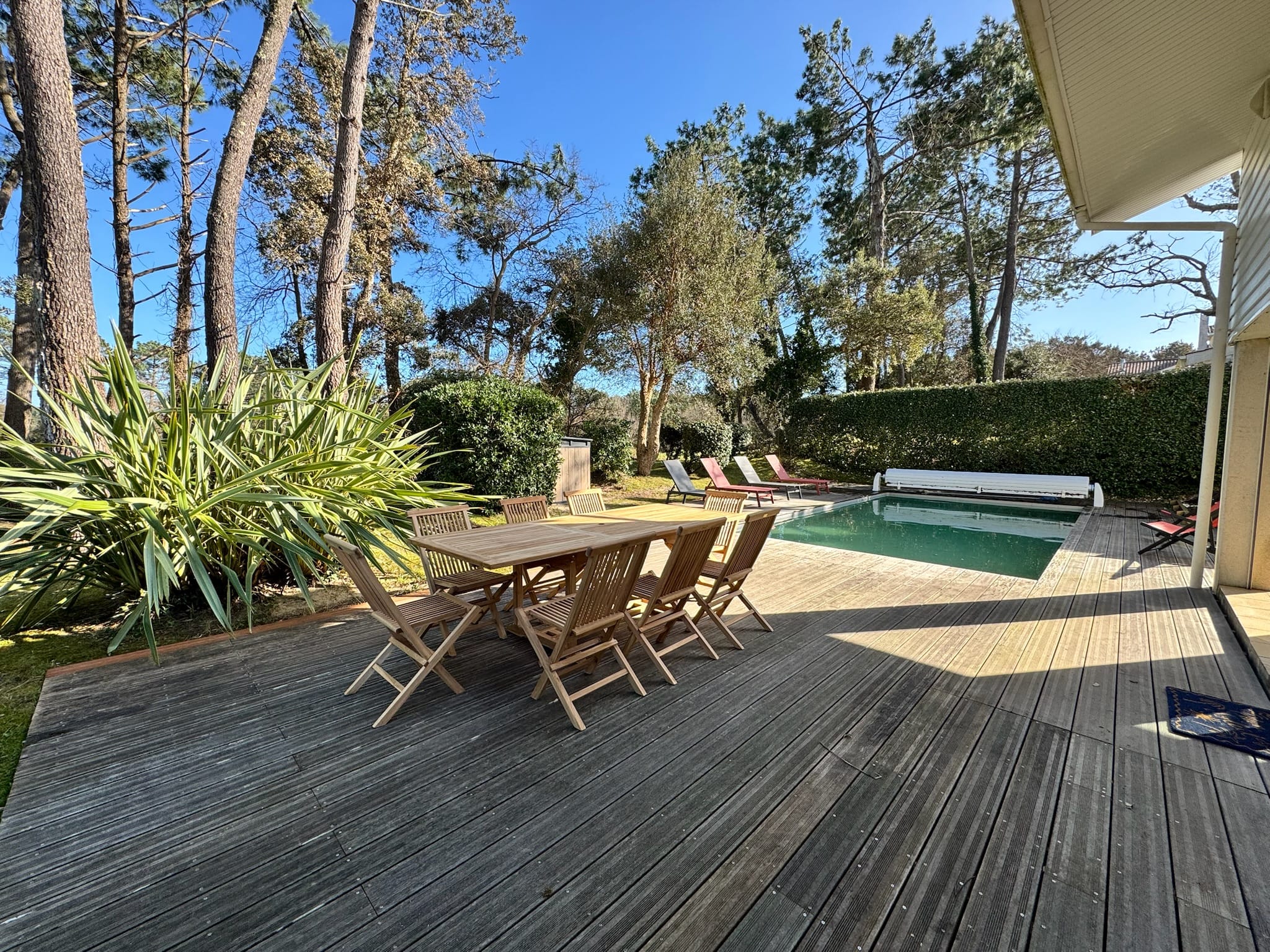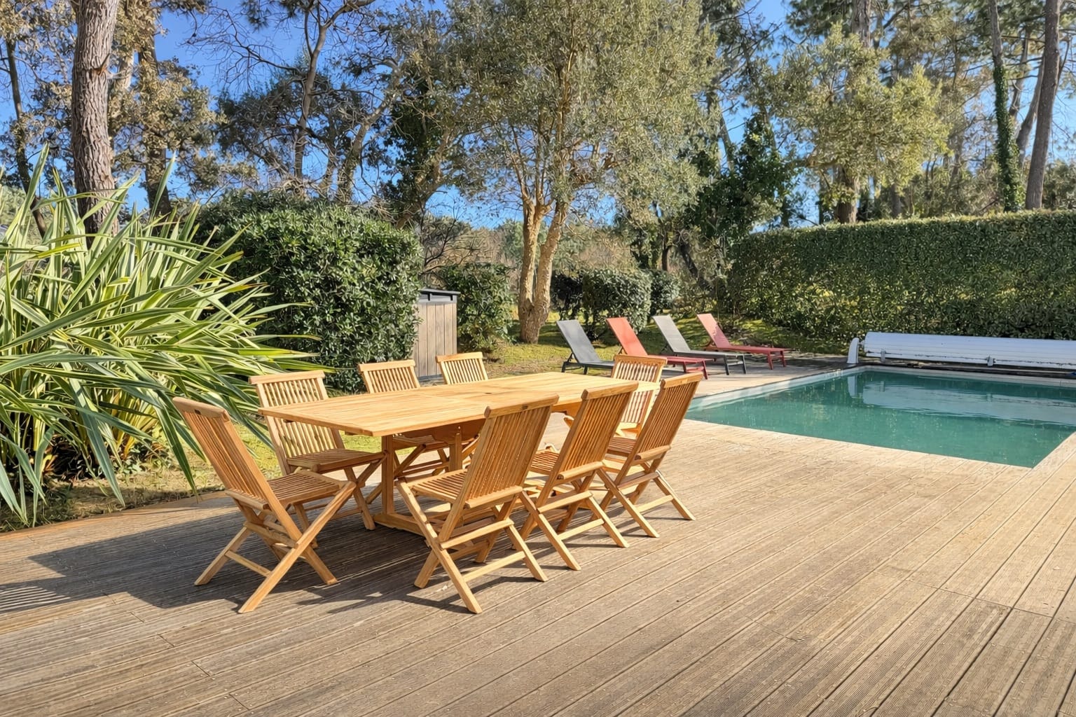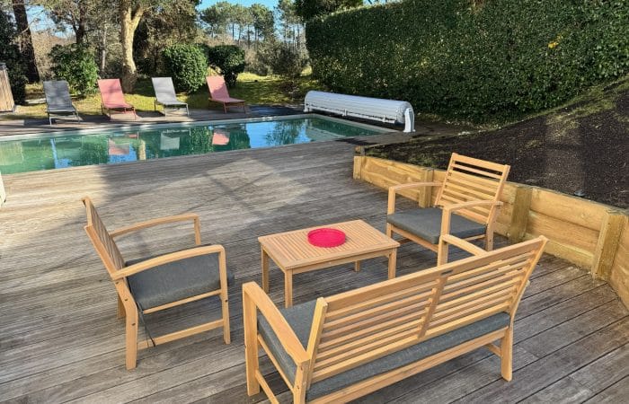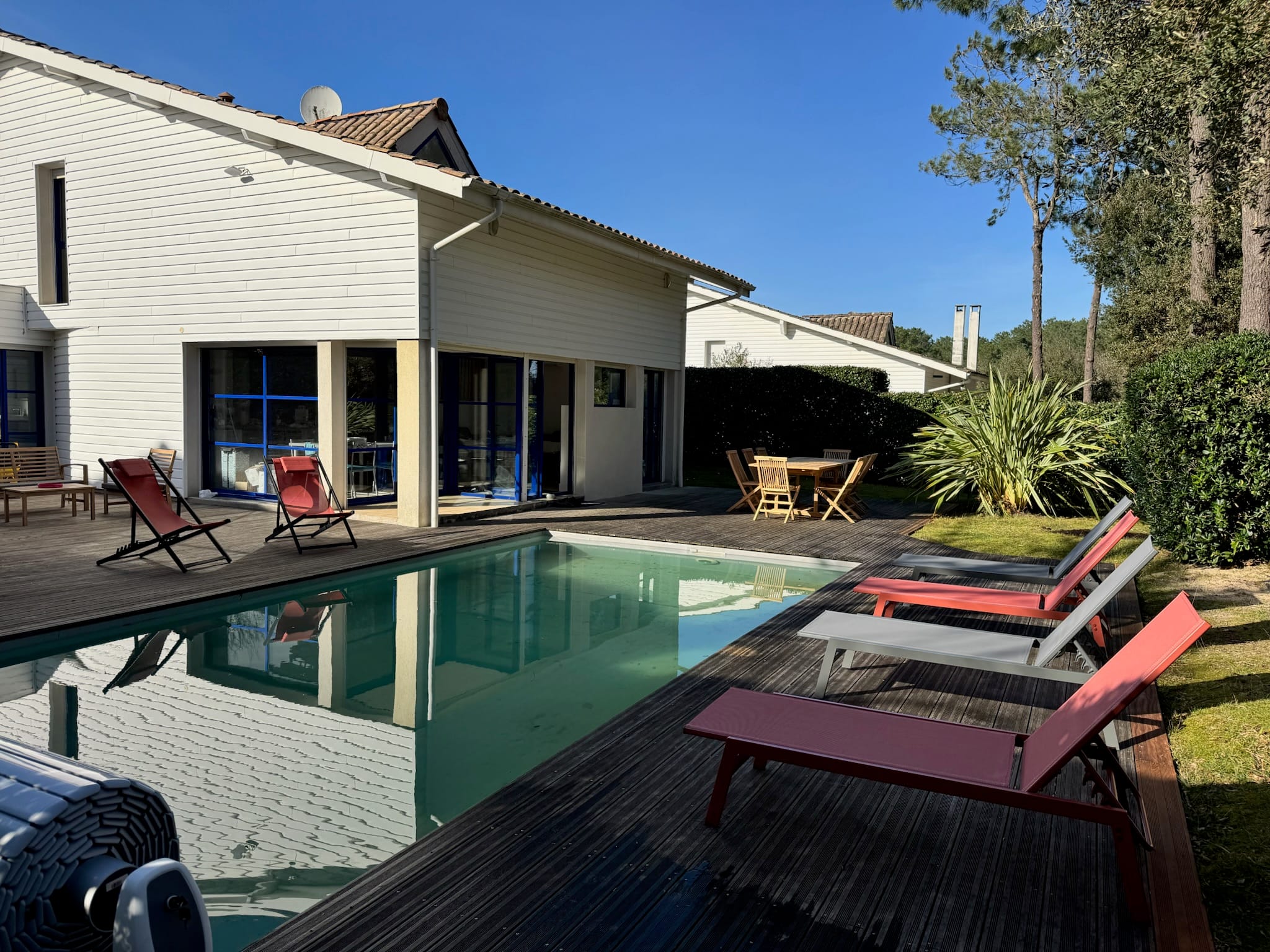 Grande terrasse, chaises longues, salon de jardin et barbecue