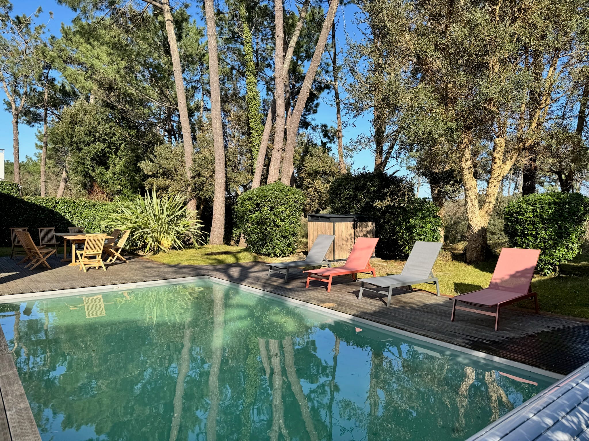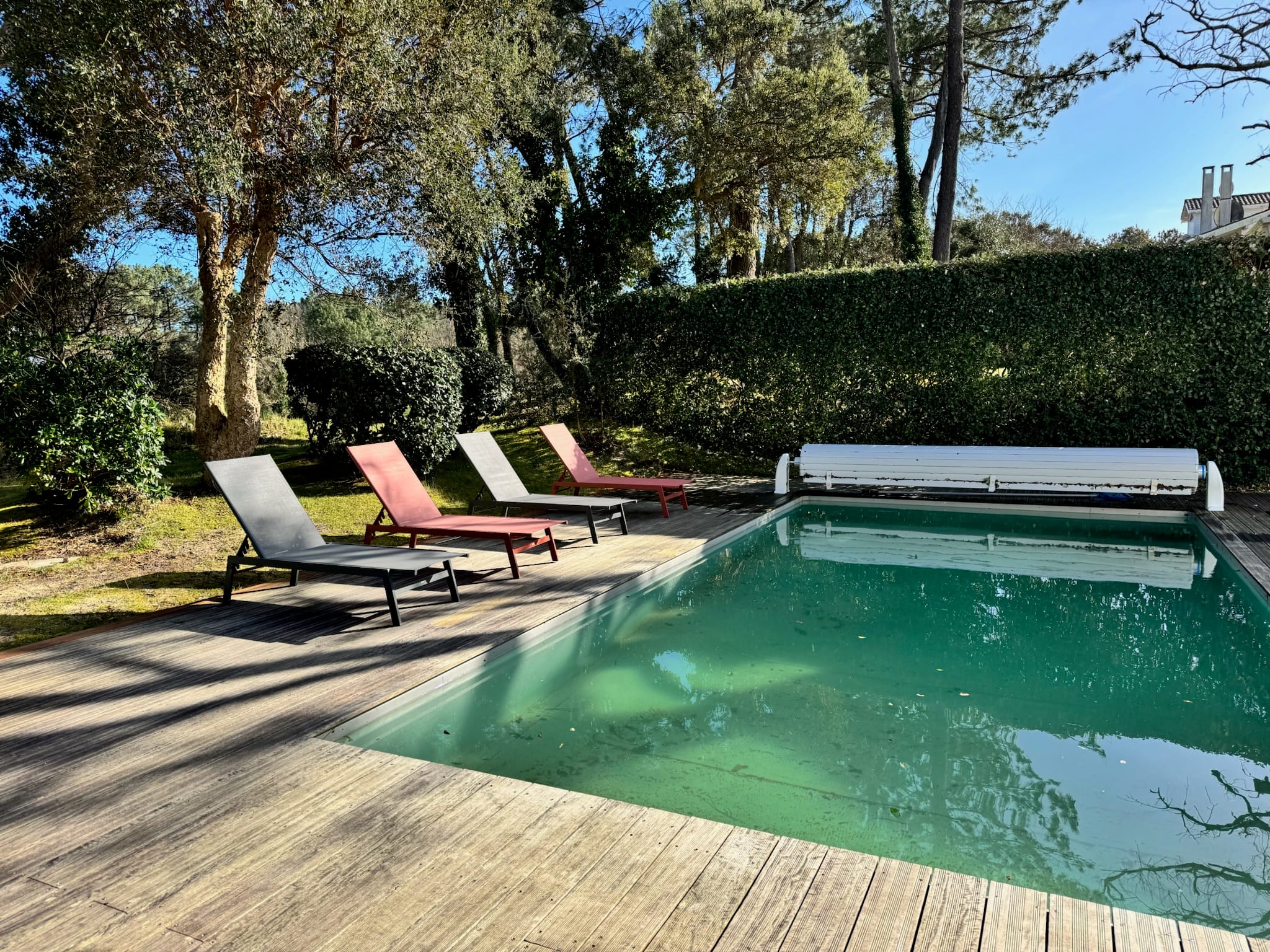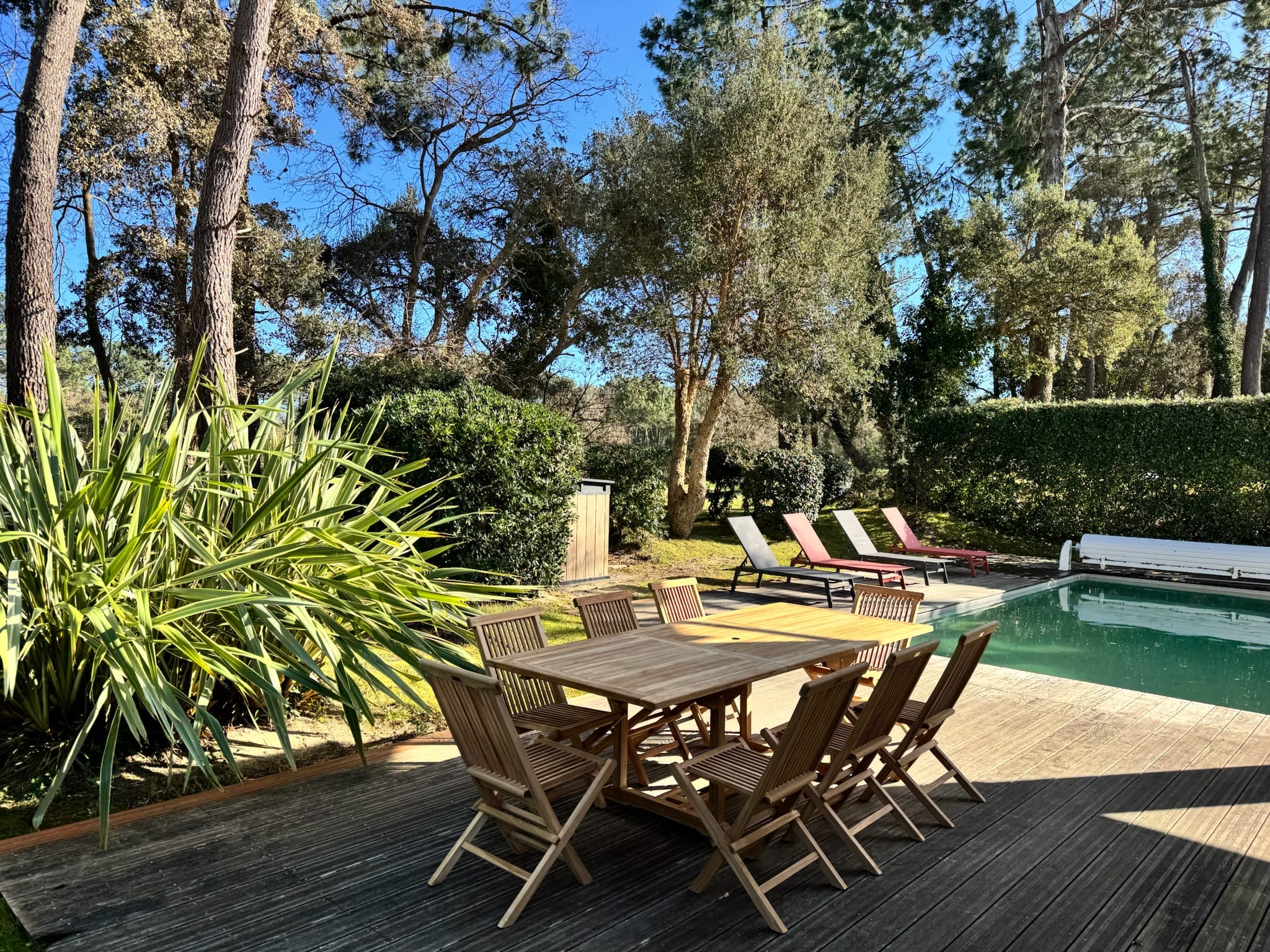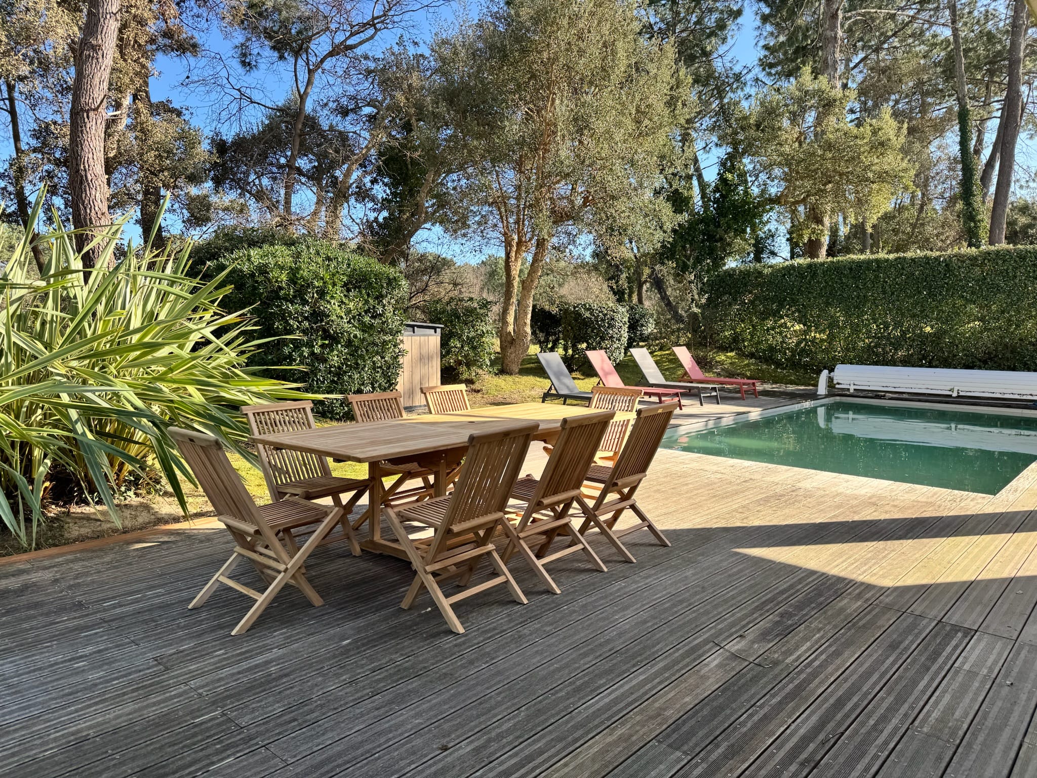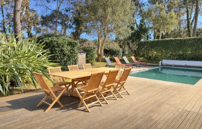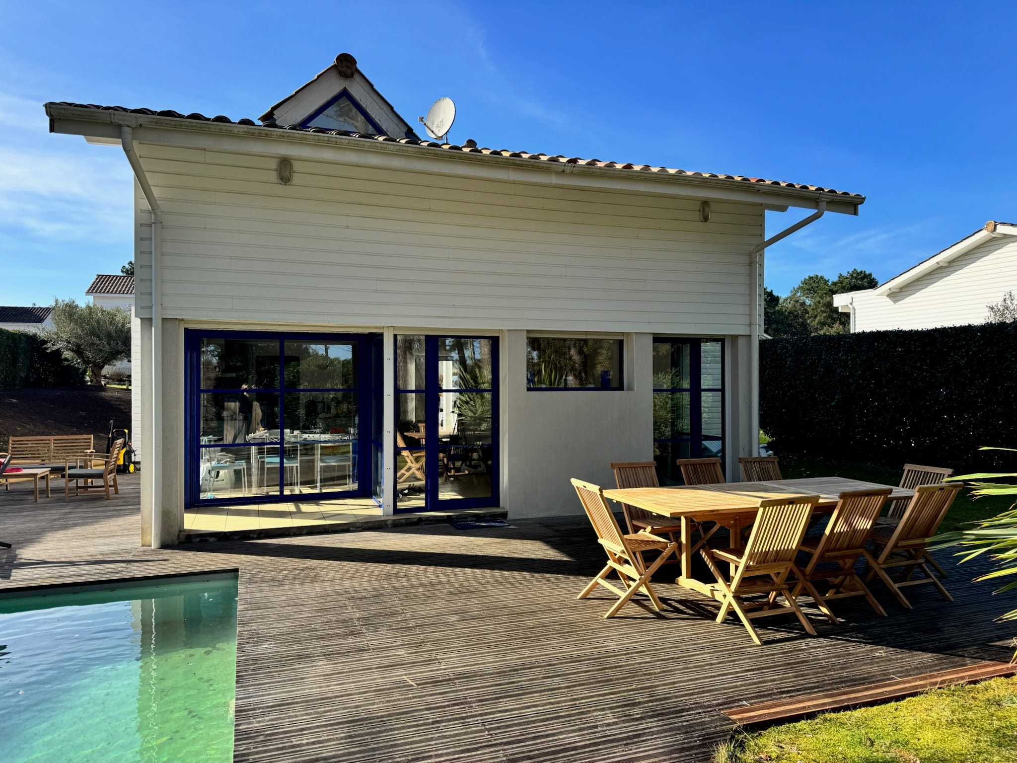 Grande terrasse, chaises longues, salon de jardin et barbecue